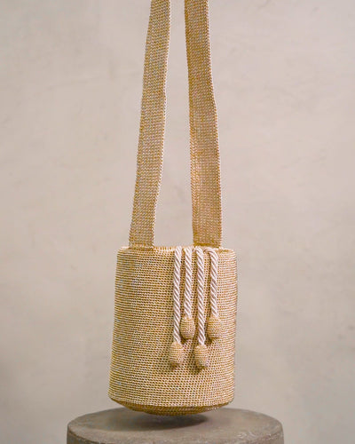 Handwoven mochila in a nido weave that reinterprets the traditional Colombian bag into a modern timeless accessory. This mochila is crafted in gold silver-plated metal threads with a beige linen lining, a pouch and two interior pockets.