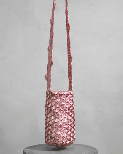 Handwoven mochila in a seashell weave that symbolizes nature, strength, and the infinite legacy that has passed through generations of Colombian artisans. This mochila is crafted in rose gold silver-plated metal threads with a beige linen lining.